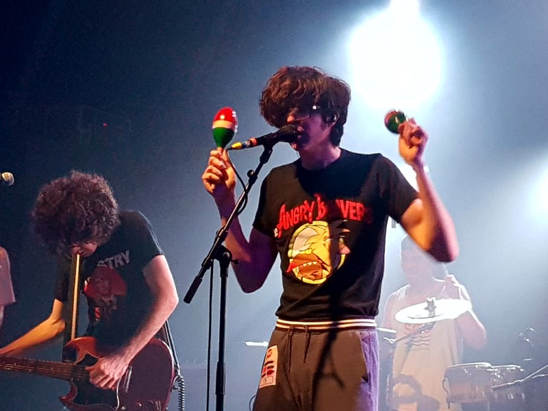 Toledo stands centre stage, guitarless for a change, in an Angry Beavers t-shirt. It’s a bit of nostalgia for all those who remember waking up Saturday morning and watching Rugrats, Hey Arnold and Doug. The band begin The Drum. Toleto’s passionate mumble vocals echo through the hall as the guitarists play off each other’s energy, the dissonant bending guitar notes ring above the rest of the band. The drummer of Naked Giants stands amongst a plethora of percussion, rapidly hitting the cowbell, tambourine and bongos. The added percussion brings further depth into what is already a well layered sound.