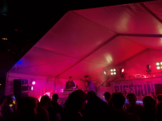 10:40pm. Kwame takes the stage as the rain picks up more. Immediately, the Sydney rapper/producer begins jumping across the stage. Armed with his mic, Kwame begins spitting bars that do not sound like the typical Aussie Hip Hop. Kwame borrows traits from American trap and pop rap; even meddling with some auto-tune. Luckily, it’s not overbearing; it’s more like modern Kanye auto-tune. His bars are crisp and slick, showing precision as his lyrics line up exactly with his production playing in the background. His hype man/DJ does an excellent job elevating Kwame with adlibs, thickening the sound on stage.