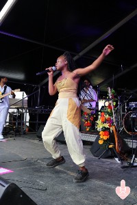 I stumble across Adrian Eagle, a young MC whose reggae and world influenced beats have brought in a sizeable crowd. I only catch the last couple tracks, but Adrian Eagle’s musical influences are clear in his music. Sampa The Great shortly makes the stage amongst a roar of applause. Her band are packed tight on the small stage, but they’ve given enough room for Sampa to dance across the stage. Armed with her mic, she spits well crafted hip-hop bars against her musical backdrop of R&B and soul. She commands attention from centre stage, her band doing an excellent job supporting, whether it’s vocally or instrumentally. Smooth bass lines pluck under her vocals, lush keys and ambient cymbals elevate her music. The sun is now beating down on The Pleasure Garden, and I am worried about the lack of sunscreen I have on my pale, freckled skin.