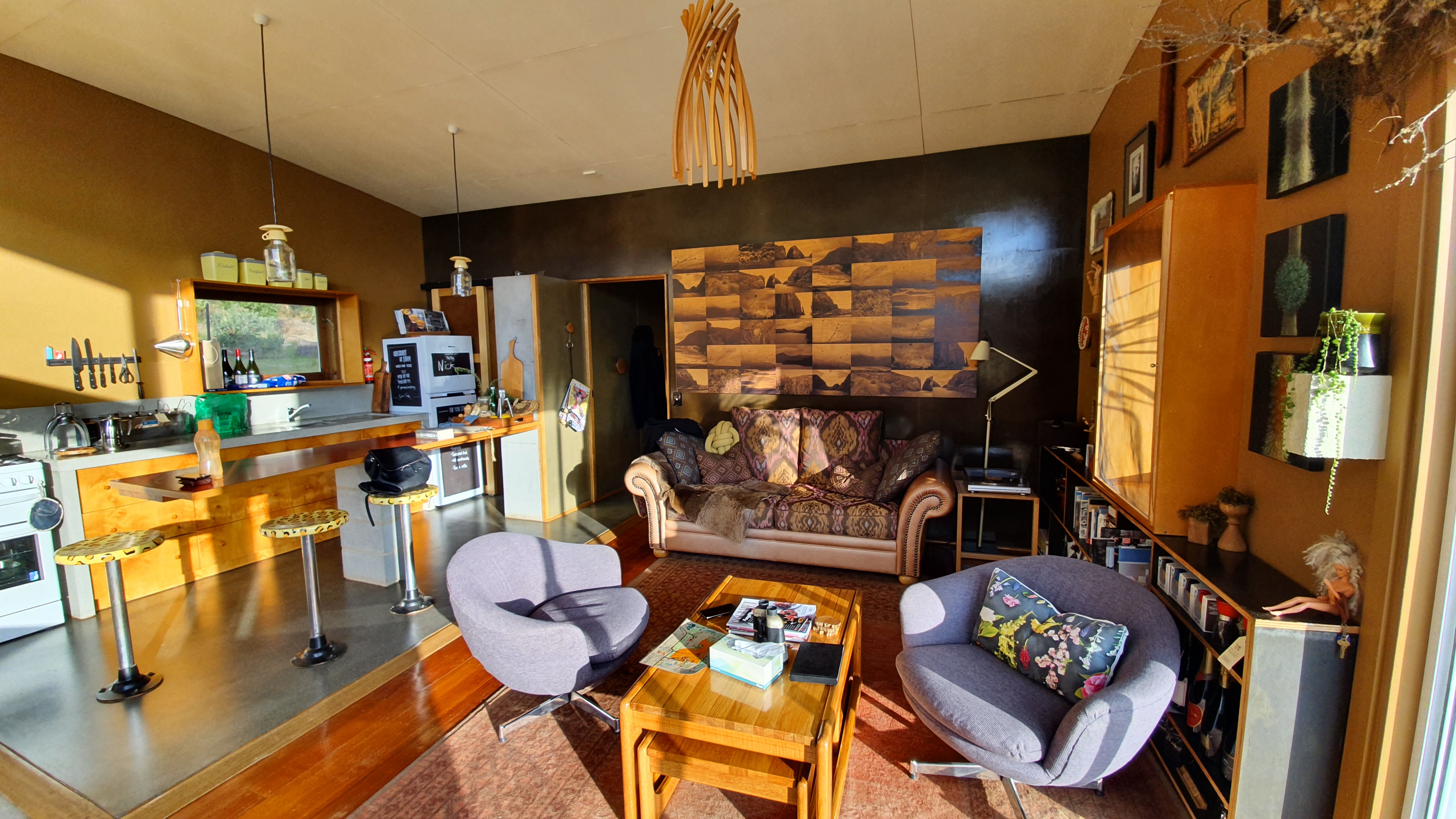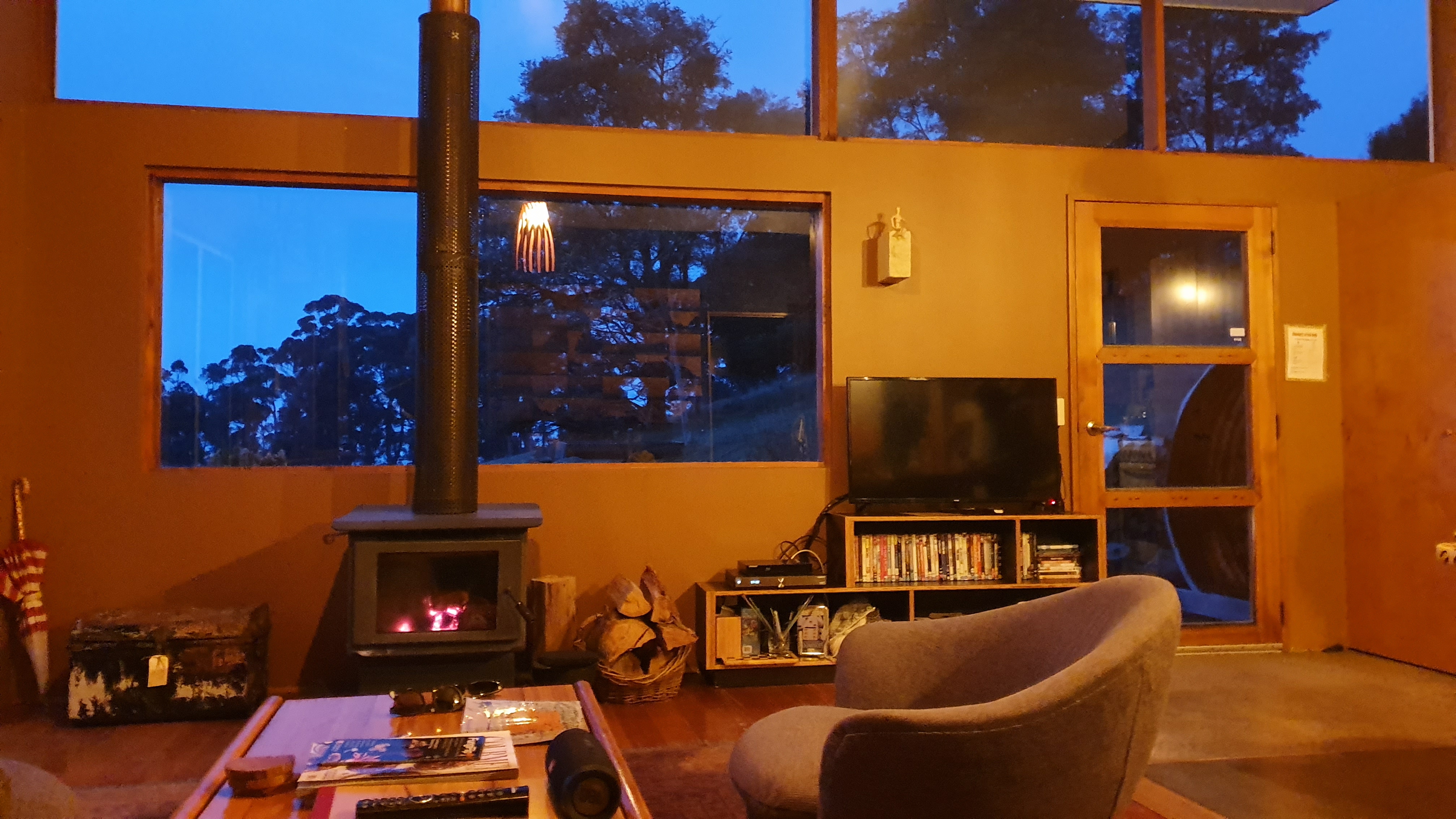 The Trig was meticulously set out, every nook carefully choreographed. A fireplace sat at the front of the living space surrounded by two-metre-high glass windows. Leather couches with woollen blankets rested against the back wall, a small library of books and collection of old records beside. A selection of red wines stood in one of the nooks, though they were not as complimentary as I would have liked. The kitchen was equipped with the necessities needed for a home cooked meal, though the gas oven needed to be lit the old-fashioned way which we would later find out. The pantry was full of pastas and rice, organic jams and spreads; the fridge full of local pale ales and produce from the property. The beers weren’t complimentary though we could eat as much seasonal fruit as we could stomach. The shower stood at the back corner of The Trig, past the kitchen area. It’s stone finished walls and indoor greenery made it feel as if we were showering in a Tasmanian cave, the temperature to match. The bedroom was spacious. Local woollen blankets were spread across a lusciously large king bed, an electric blanket tucked underneath for extra warmth. Shrubs and branches from the outside wilderness brushed against the bedroom window reminding us of the secluded serenity of the property.