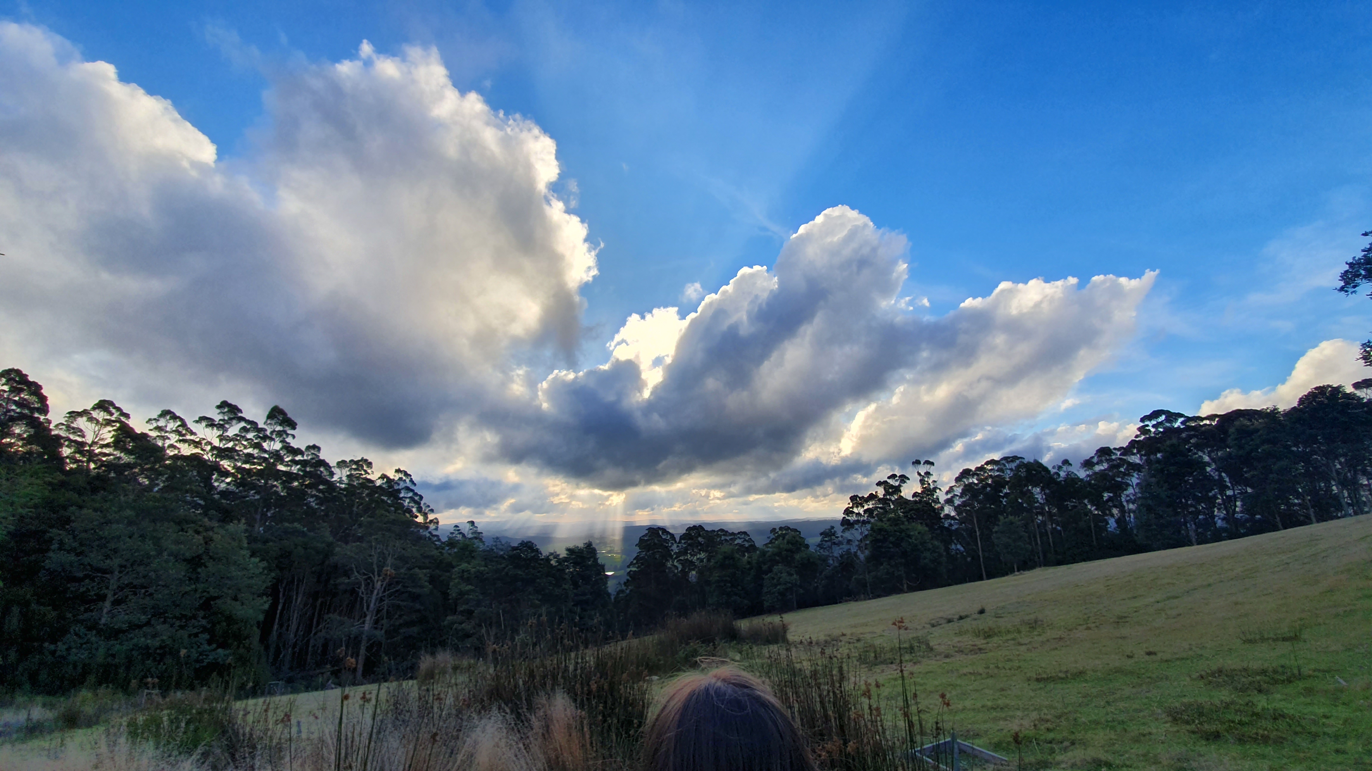 The climb up the mountain wasn’t a strenuous one. The highway from Launceston to Lilydale was calmer than those down south, the landscape much greener in comparison too. The further north, the more it felt like a foreign country compared to where we had come the days prior. Each pocket of Tasmania we had driven through could be it’s own country, individual biomes littered the island at the bottom of the world. We turned onto a dirt road as the rain began to fall. It wasn’t heavy, just enough for the wipers to carry across the windscreen. The dirt road climbed the green mountainside. Cows greeted us along property fence lines. Soon we were encompassed by thick foliage on either side. The road became narrow and towering trees blocked the little sunlight that was trying to peer through. We were on the lookout for The Trig, our eco-lodge for the next couple days. The car continued to twist along damp dirt bends before a small sign poked out from the shrubs. The Trig. The rain turned into a drizzle as I parked the car at the foot of the hillside property. To the left was the thick tree line that covered the pass, to the right and beyond laid rolling hills and thick marshmallow clouds. Sun began to peer through the clouds as they broke above the Lilydale township below. The sun’s gaze was misty and thin as it pirouetted through the clouds. It was heavenly and picturesque like God’s own work.